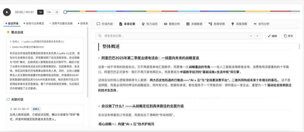 就拿一段会议录音来说,大部分大模型的处理方式只是生成语音转写出来的文字稿,而超级麦吉交付的则是一个可交互的分析界面,包含智能播放器、会议纪要、量化数据、权力动态、意图分析等。